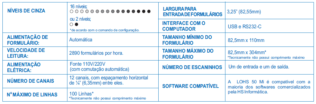 - Tamanho dos formulários: 63,55mm x 110 mm até 228,6mm x 355,6 mm,(Carta, A4 e Ofício), leitura em um ou nos dois lados do formulário.